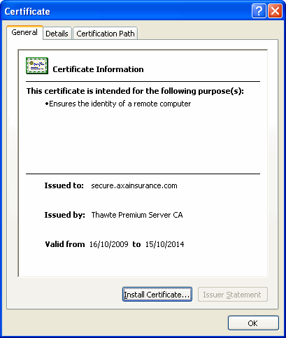 Make sure the domain is owned by the company you expect to interact with by double-clicking on the lock icon in your browser. The key to look for is that the domain axainsurance.com in the following example is present.